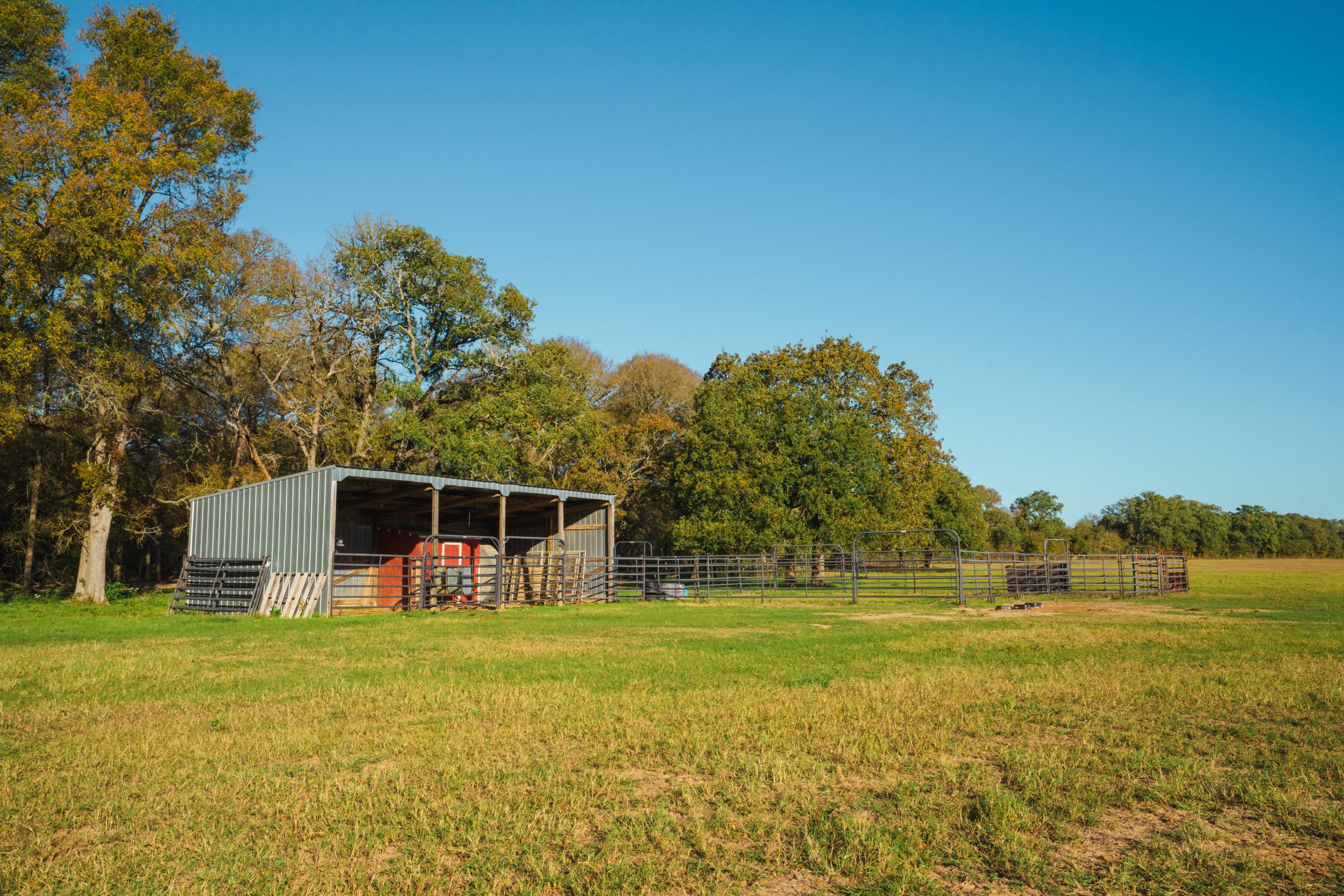 The fully enclosed shed is 2,250+/- square feet which is currently used for equipment storage and a workshop. It includes (5) 12x12 automatic bay doors with garage door openers for each. On the back side of this shed is a covered dog run that is 600+/- square feet. There is an open shed near the home that is 2,030+/- square feet, as well as a horse barn in the front pasture near one of the ponds that is 600+/- square feet and includes an enclosed tack room.