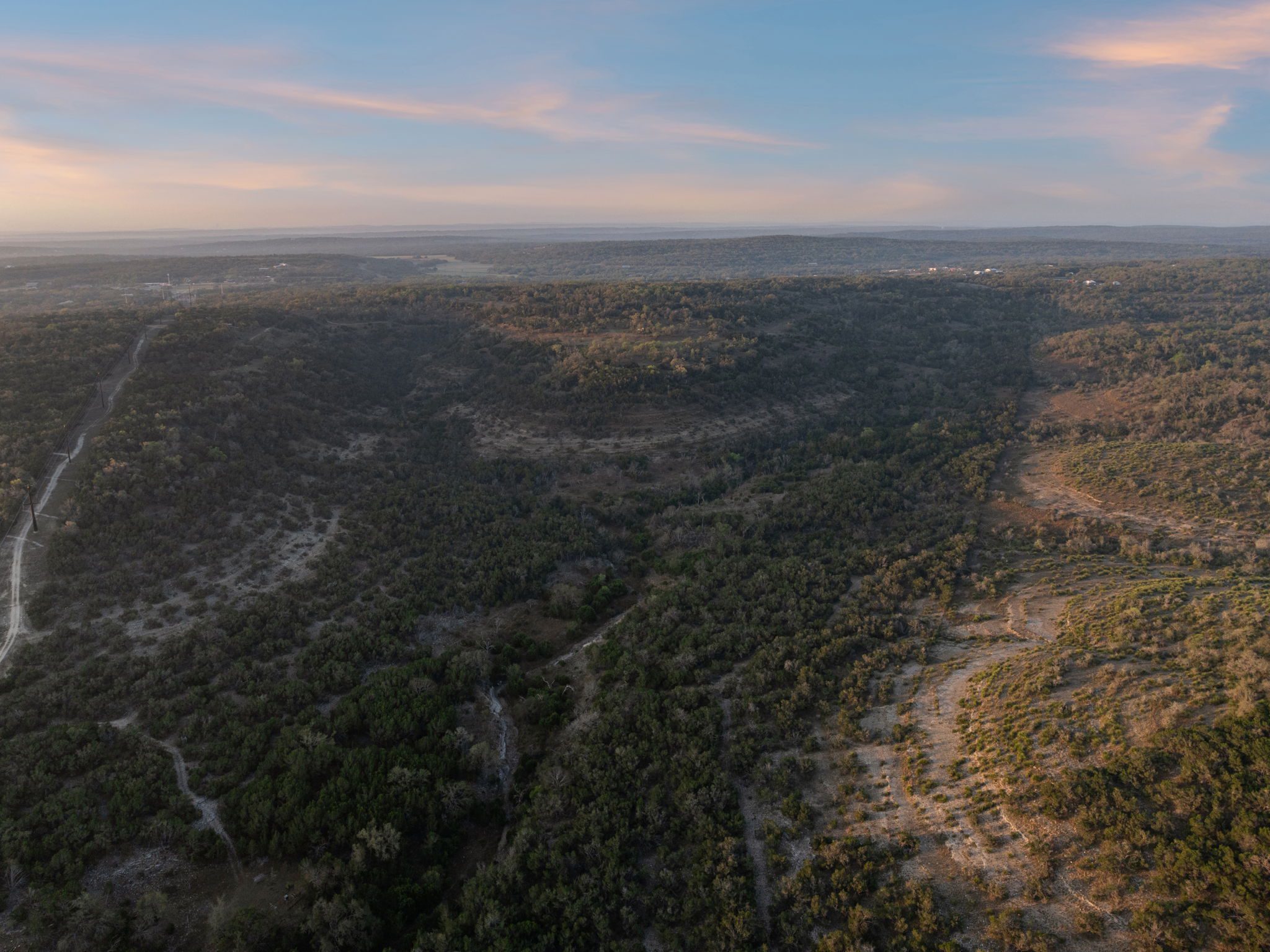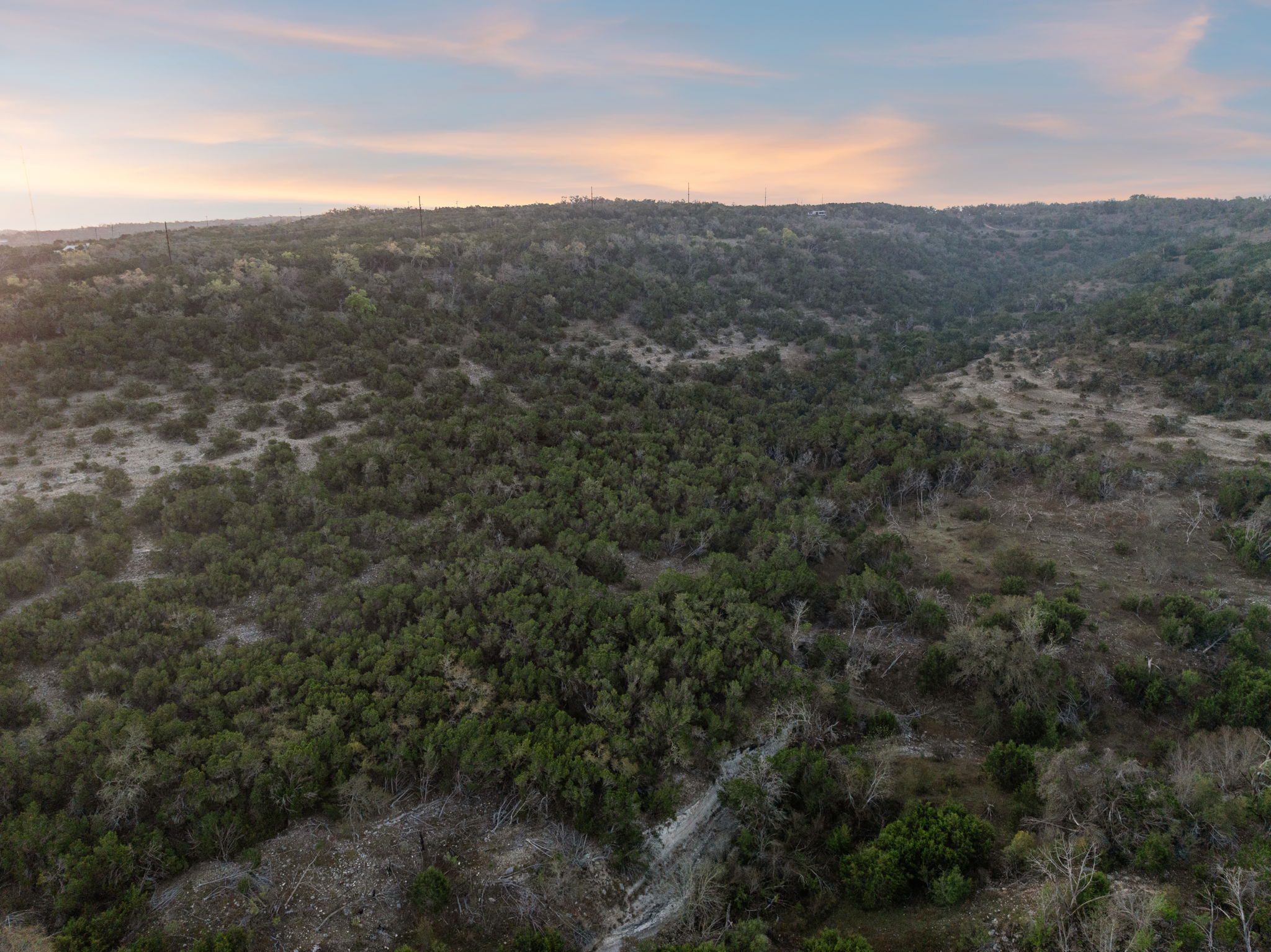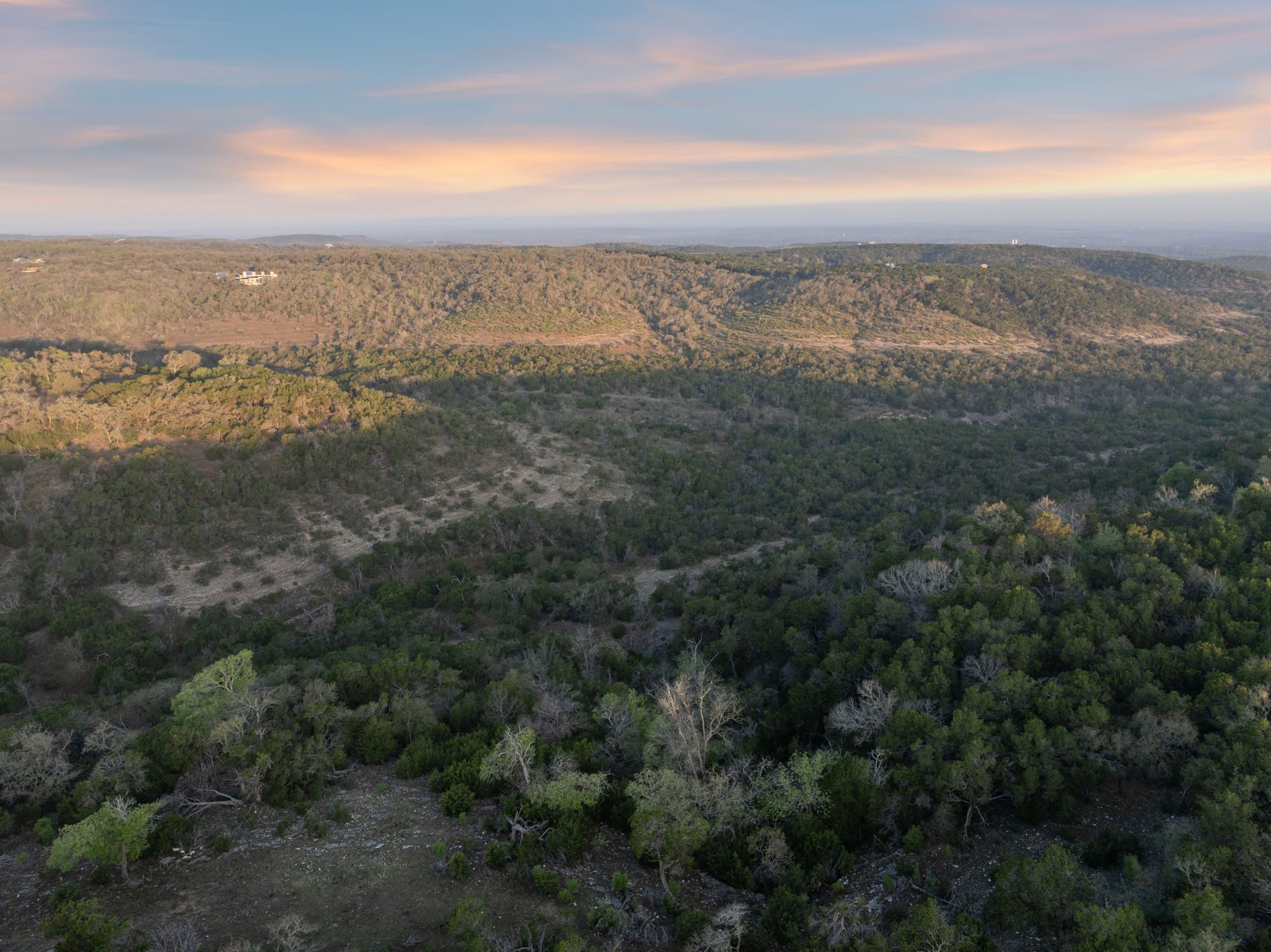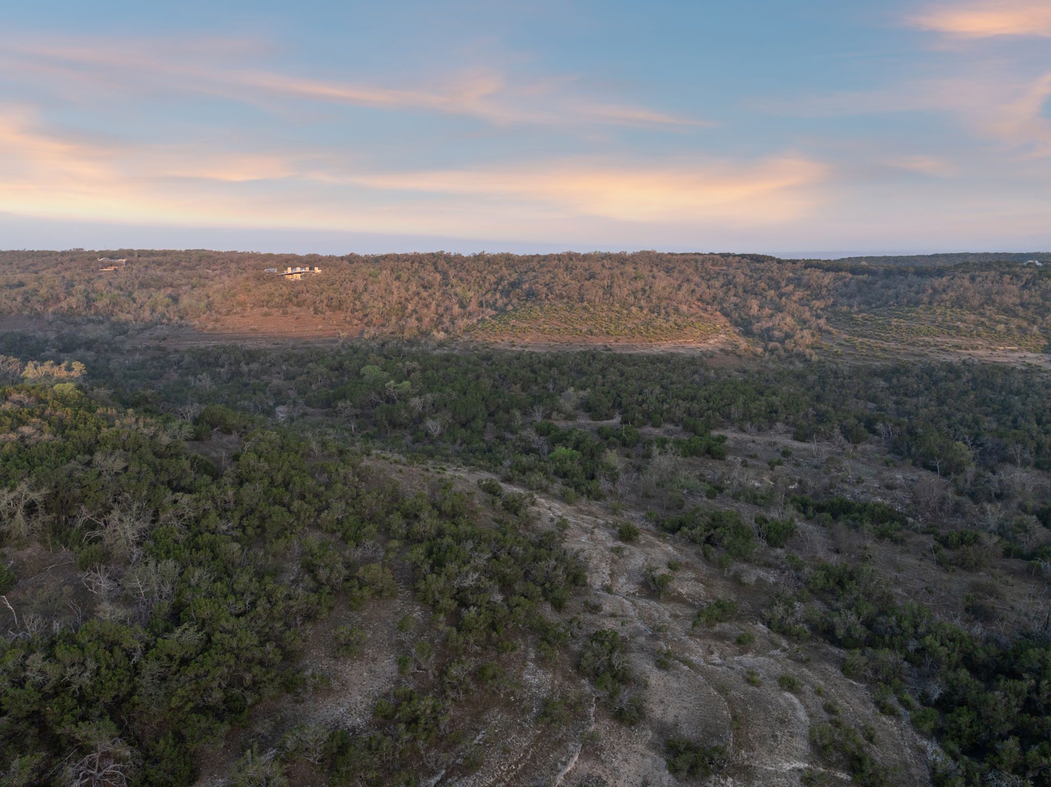 The ranch features rolling hills, mature oaks, cedar, and native brush, creating a scenic and private setting. Two seasonal creeks meander through the property, exposing dramatic limestone formations. With elevation ranging from 1,200± feet at the southeastern end to 1,020± feet to the northwest, the land offers multiple prime building sites with stunning sunset vistas.