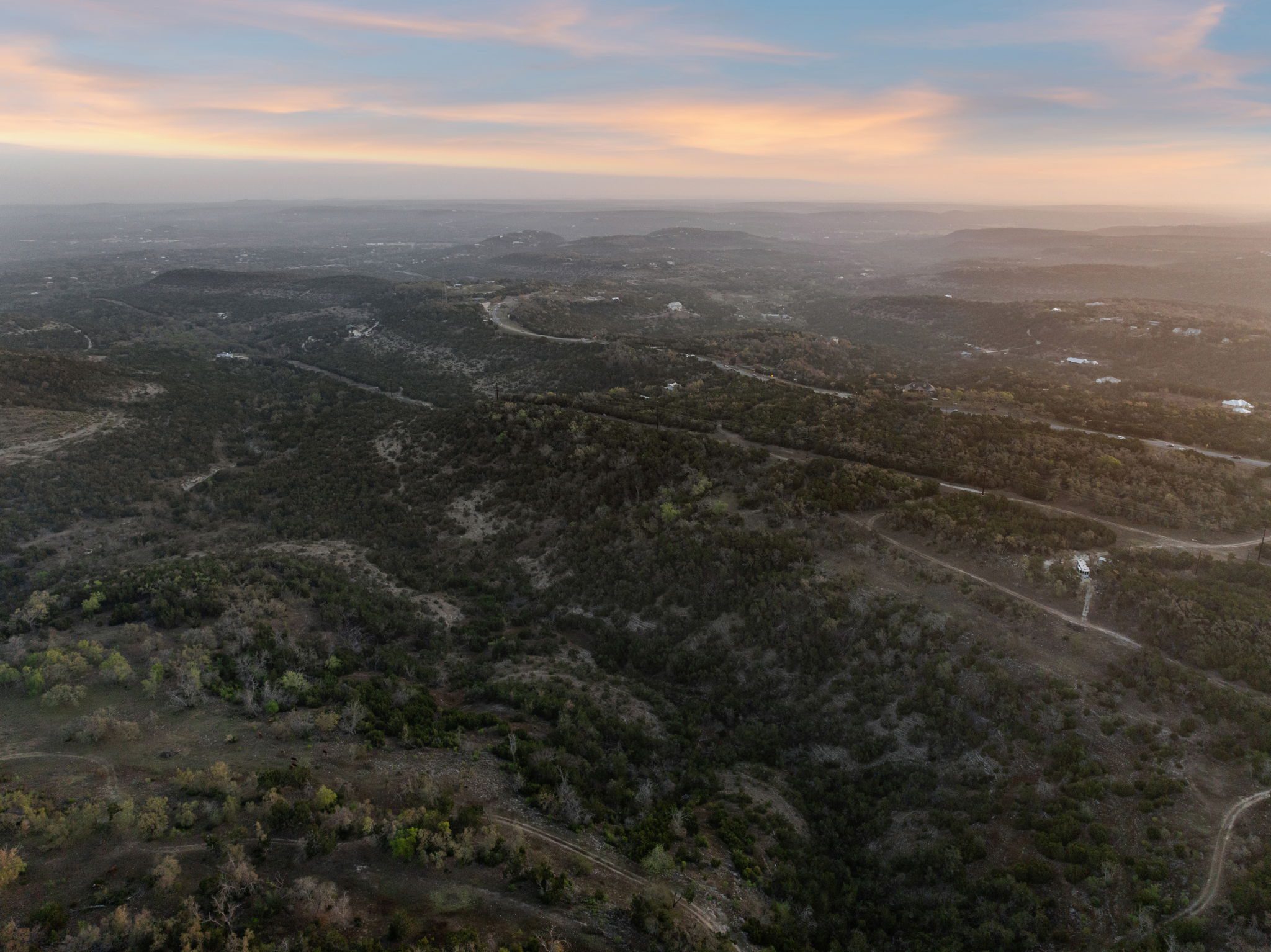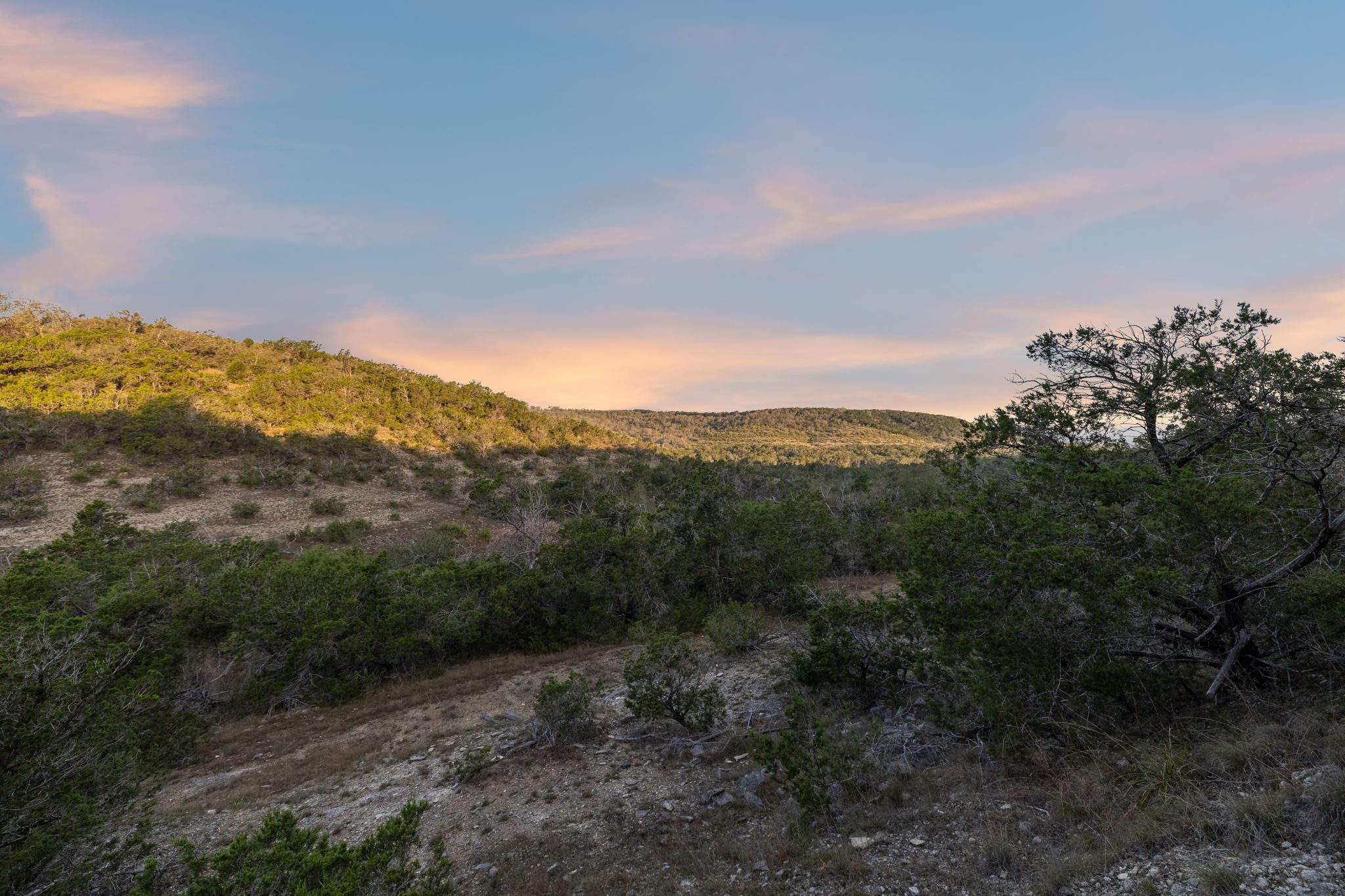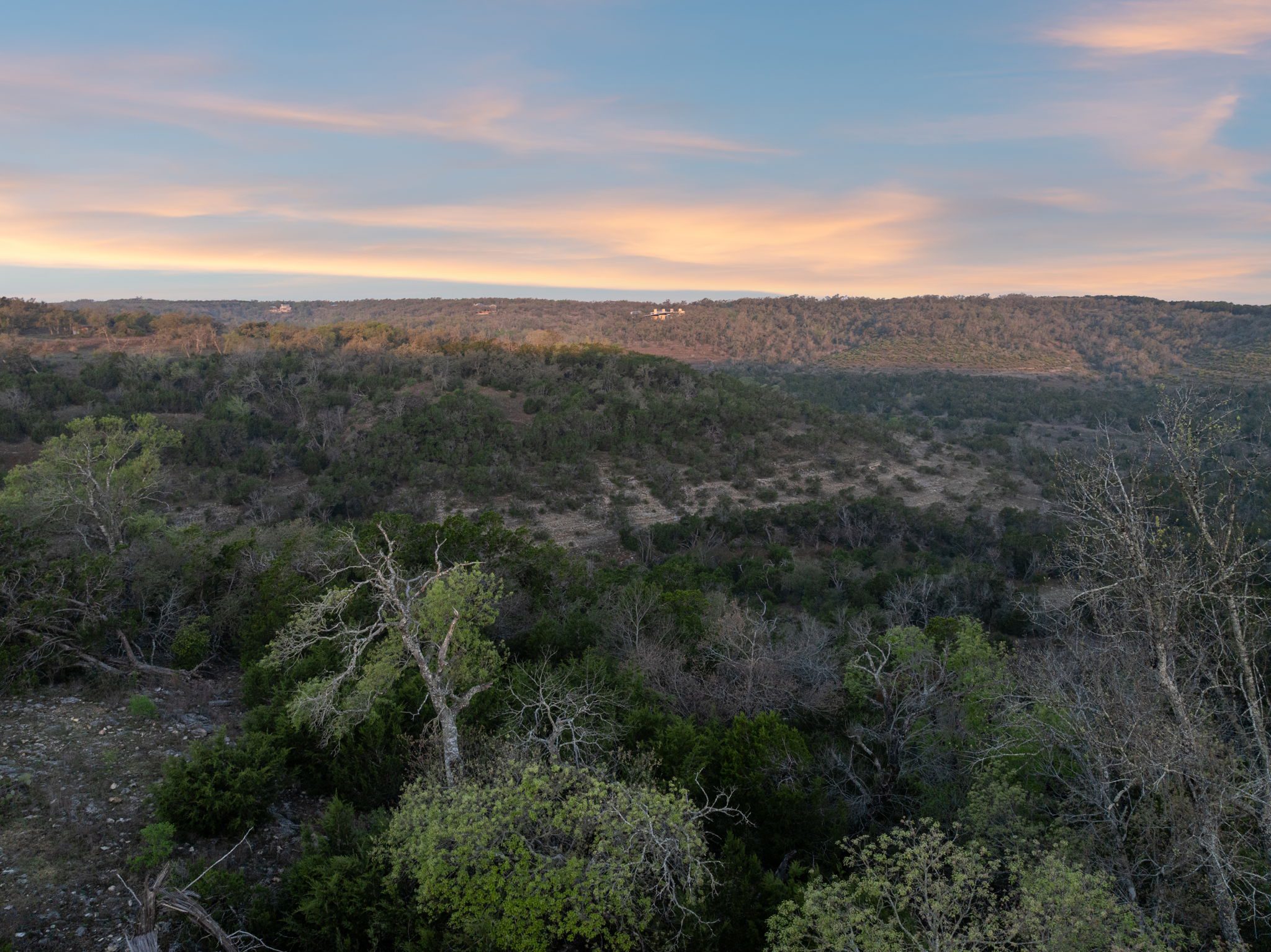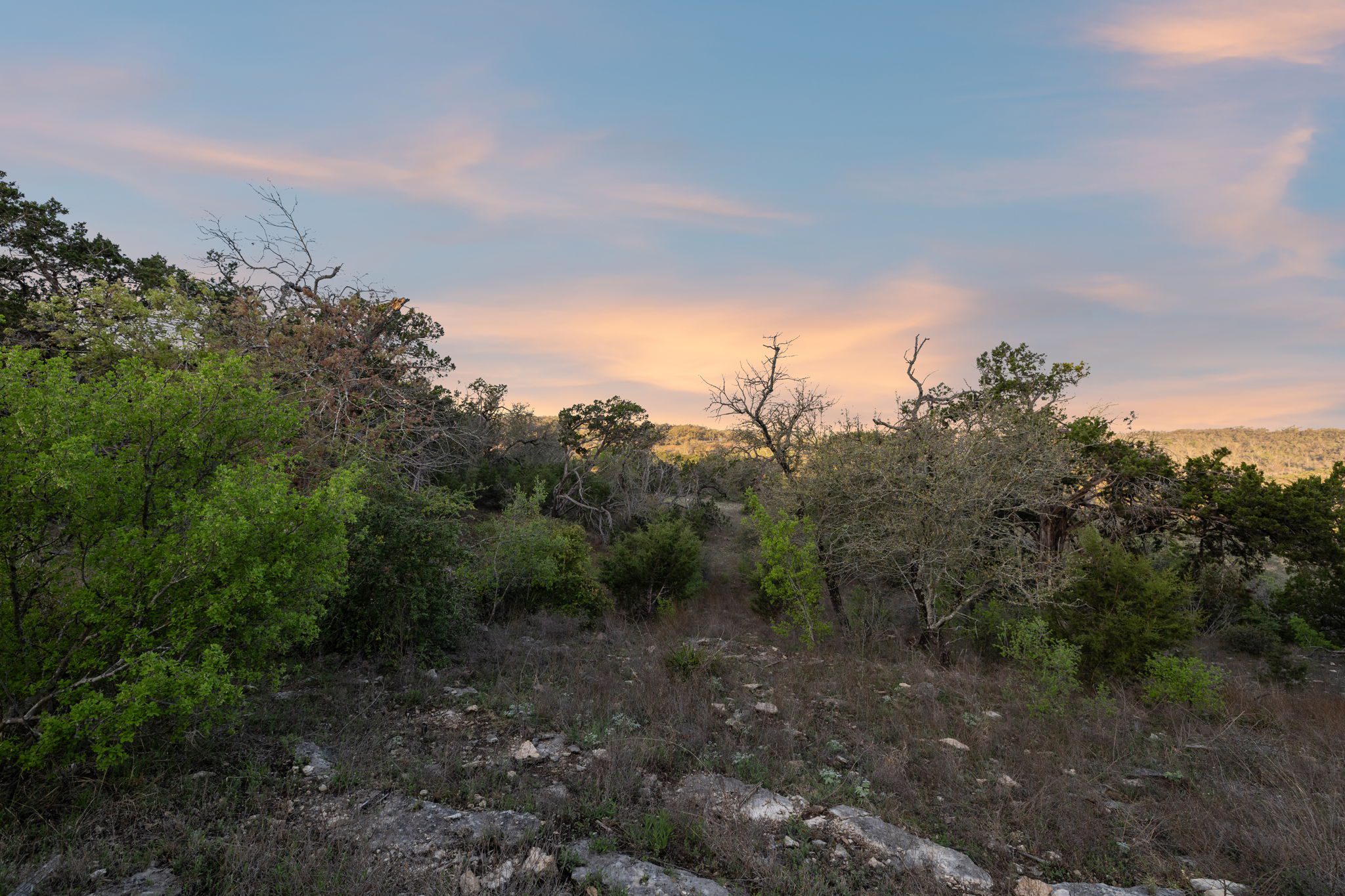 The ranch features rolling hills, mature oaks, cedar, and native brush, creating a scenic and private setting. Two seasonal creeks meander through the property, exposing dramatic limestone formations. With elevation ranging from 1,200± feet at the southeastern end to 1,020± feet to the northwest, the land offers multiple prime building sites with stunning sunset vistas.