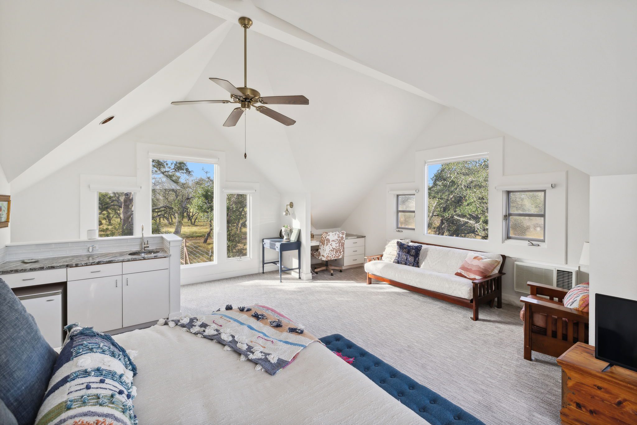 The 1,906 sq.ft. white stone house is a cozy 2-bedroom, 2-bathroom home that overlooks the river, offering comfort and charm. A separate 594 sq.ft. studio above the garage includes an additional bedroom and bathroom, making it ideal for guests or a private workspace. Outdoor enthusiasts will appreciate the recreational opportunities, with excellent fishing and hunting right on the property.