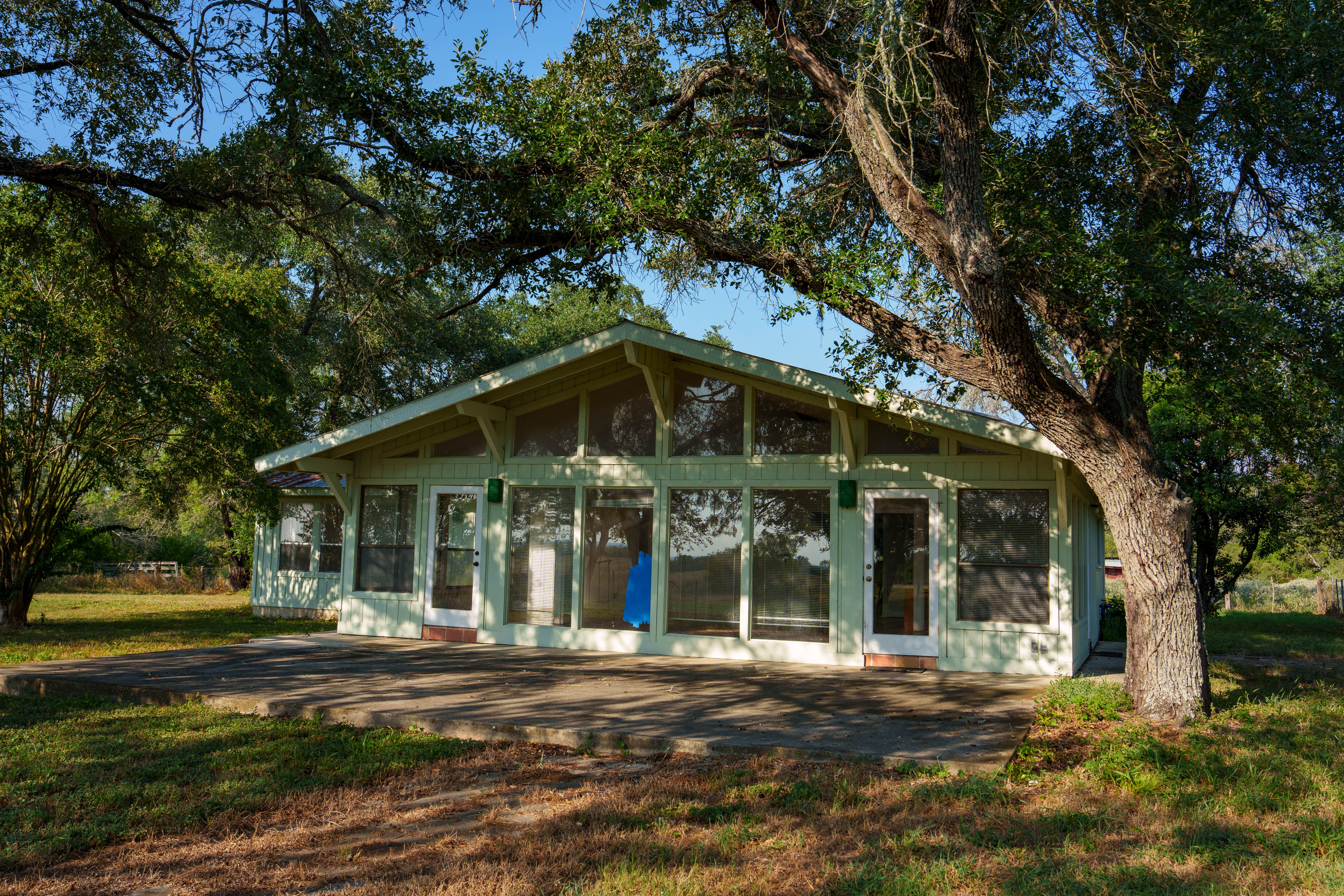 The main home is a 3-bedroom, 2-bathroom residence designed to take in the landscape. Large windows wrap around the house, framing views of oak trees and flooding the home with natural light. The open floor plan offers a clean canvas—whether you’re envisioning a private retreat, a Hill Country wedding venue, or guest lodging.